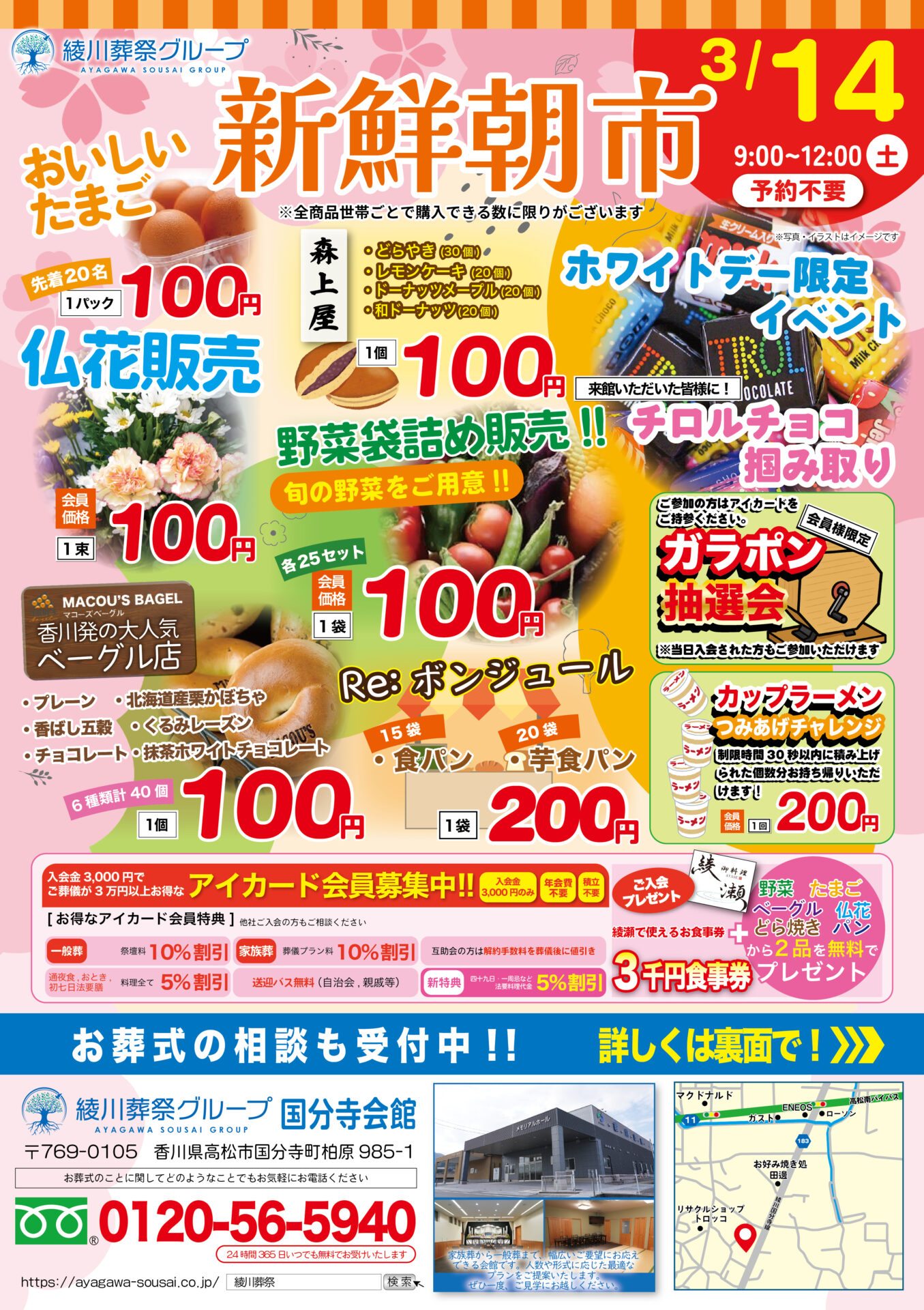 3月14日に高松市の会館、「綾川葬祭国分寺会館」で朝市を開催いたします。